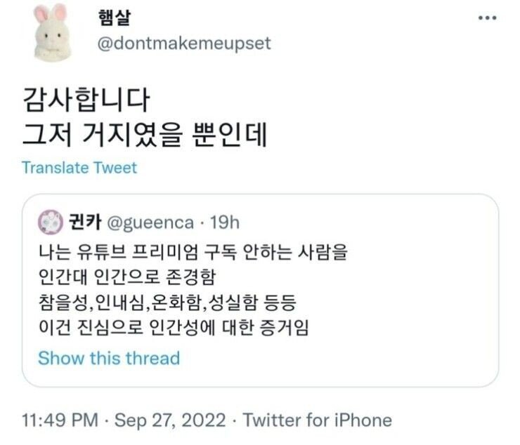 콜드부팅님의 댓글 콜드부팅쪽지보내기 메일보내기 자기소개 아이디로 검색 전체게시물쪽지보내기 메일보내기 자기소개 아이디로 검색 전체게시물 작성일 2024.08.13 16:08 나도 프리미엄 안쓰는데 웃긴건 온갖 OTT는 다 결제해서 보는데 유튭만 안함 나도 프리미엄 안쓰는데 웃긴건 온갖 OTT는 다 결제해서 보는데 유튭만 안함