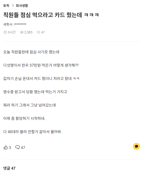 참스님의 댓글 참스쪽지보내기 메일보내기 자기소개 아이디로 검색 전체게시물쪽지보내기 메일보내기 자기소개 아이디로 검색 전체게시물 작성일 2024.08.09 16:26 점심에 저런거면 회식 안해도 된다고 나올게 뻔해서 서운해서 저런거임 ㅋㅋㅋㅋㅋㅋㅋㅋ 직원들이 선수친거임 ㅋㅋㅋㅋㅋ 점심에 저런거면 회식 안해도 된다고 나올게 뻔해서 서운해서 저런거임 ㅋㅋㅋㅋㅋㅋㅋㅋ 직원들이 선수친거임 ㅋㅋㅋㅋㅋ