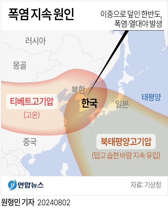 (서울=연합뉴스) 원형민 기자 = 전국적인 폭염이 8월 초에도 계속된다. 기상청에 따르면 대기 하층은 서풍에 의해 따뜻하고 습한 공기가 유입된 가운데 중상층에는 고온의 티베트고기압과 북태평양고기압이 한반도를 이중으로 덮으면서 전국 대부분 지역에서 폭염이 지속되고 있다고 밝혔다.
