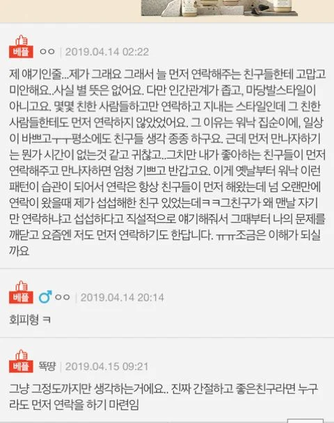 그냥 저랑 만나고 싶은 마음이 크지 않다고 하면 문제될 게 없지만,제가 먼저 선톡을하면 엄청 반가워하고 몇월며칠 날짜를 정해서 이 날 볼까 라고 물으면무조건 좋다고 하고, 또 한동안 연락이 닿지 않으면 요새 바빴냐고 물으며 섭섭한 마음을드러내기도 한다는 겁니다.친구가 섭섭해하니 저도 조금 신경써서 그 다음부턴 안부 묻거나 하게 되구요..그러면서 난 언제나 열려있으니 연락 언제든 달라, 라고 하면 또 연락 없고 ㅋㅋㅋㅋㅋ