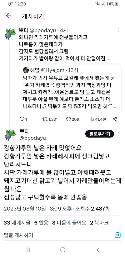타키투스님의 댓글 타키투스쪽지보내기 메일보내기 자기소개 아이디로 검색 전체게시물쪽지보내기 메일보내기 자기소개 아이디로 검색 전체게시물 작성일 2024.08.20 22:49 실제로 탄수화물 함량에서 식이섬유를 제외한 것을 다 당이라고(당류 +당질) 보시면 됩니다. 오뚜기카레는 백그람당 15그람이 다 당인거죠 15그람 다 섭취하면 혈당 45정도 올라갑니다 거기에 밥이나 감자 먹음 더 올라가는거죠 순탄수양만큼요 실제로 탄수화물 함량에서 식이섬유를 제외한 것을 다 당이라고(당류 +당질) 보시면 됩니다. 오뚜기카레는 백그람당 15그람이 다 당인거죠 15그람 다 섭취하면 혈당 45정도 올라갑니다 거기에 밥이나 감자 먹음 더 올라가는거죠 순탄수양만큼요